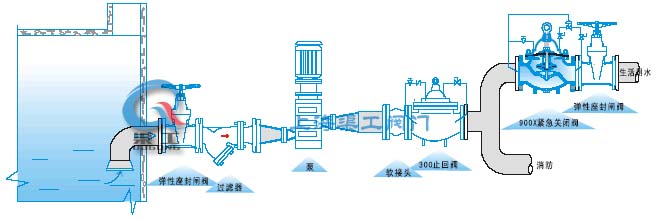 900X緊急關閉閥用于生活供水和消防供水并聯供水系統中,正常情況供生活用水,當火災發生時消防用水時,900X緊急關閉閥自動關閉生活用水,可以有夠量的消防用水。當消防停止用水時壓力減少,900X緊急關閉閥自動恢復生活用水,該閥使系統不需要另設消防單獨供水管網,大大地節省了工程建設成本和日常的用水量。該閥控制靈敏、調試簡單、使用時間長。